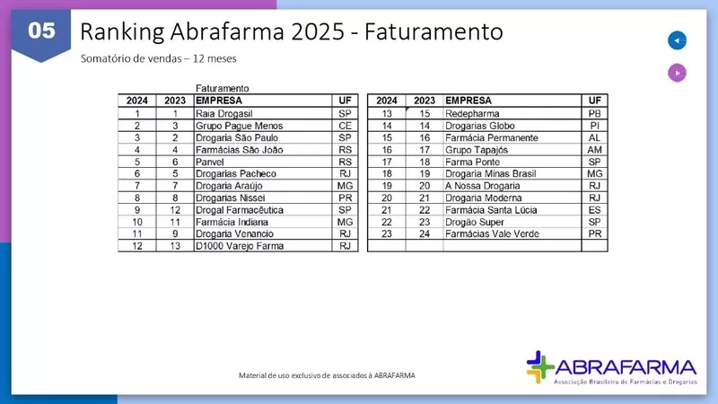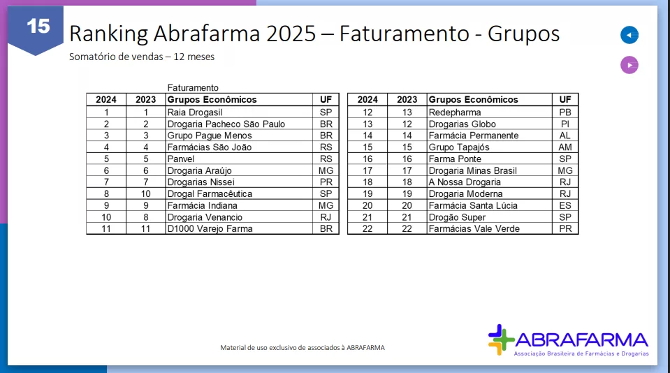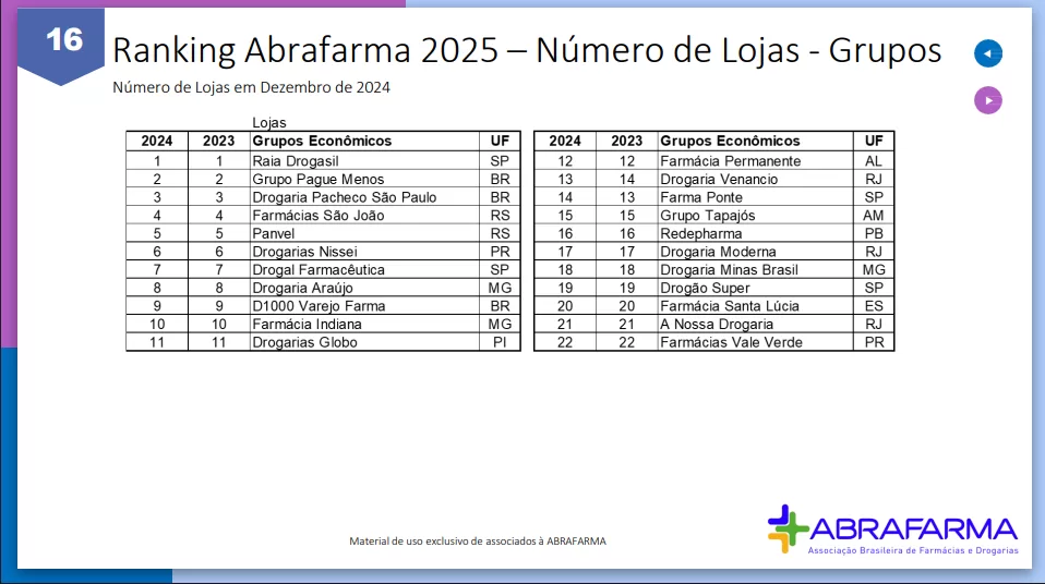 “O ranking mostra como as redes associadas vêm se consolidando não apenas pela consistência nas vendas, como também pelo compromisso de disseminar saúde, bem-estar e conveniência a todo território nacional. Com 11% dos pontos de venda do país, respondemos por cerca de 53% das dispensações de medicamentos”, reforça Sergio Mena Barreto, CEO da Abrafarma.